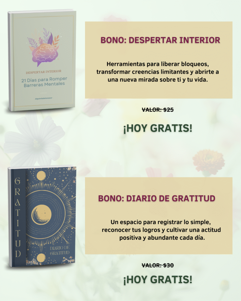 Incluye un recorrido práctico y profundo de 30 días con ejercicios diarios terapéuticos, herramientas de autoconocimiento, escritura consciente, visualizaciones y prácticas para calmar la ansiedad, fortalecer tu amor propio y reconectar contigo. Además, recibirás 7 bonos digitales complementarios.