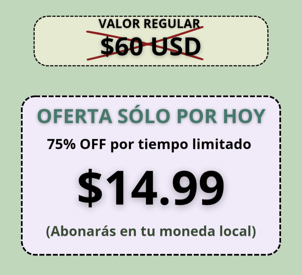 Para comprar, simplemente haz clic en cualquiera de los botones de esta página. Serás dirigida a la plataforma de pago segura de Hotmart, donde podrás ingresar tus datos y elegir el método de pago que prefieras. Una vez confirmada la compra, recibirás tu acceso automáticamente en el correo que registraste. (Recuerda colocar correctamente tu mail)